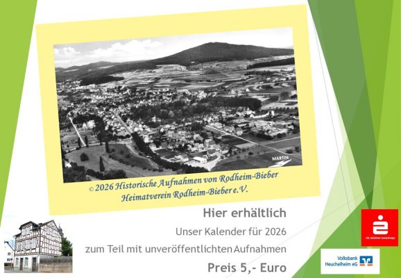 Ab sofort ist unser neuer Monatskalender „2026 Historische Aufnahmen von Rodheim-Bieber“ zum Teil mit bisher unveröffentlichten Aufnahmen erhältlich.
